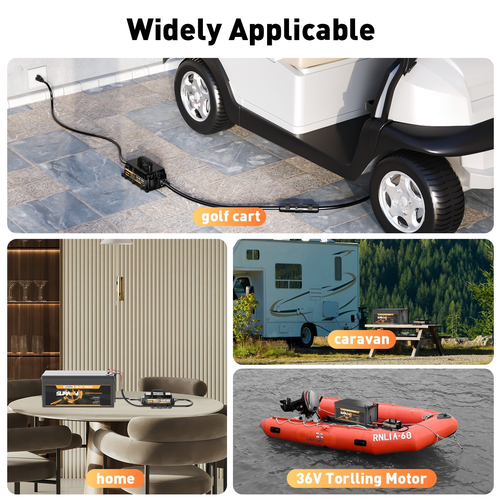 【Widely Applications】The Suraziki charger ensures a consistent flow of power for various applications including charging your golf cart, 36V trolling motor, home energy storage, and catering to all your power requirements. With certifications from CE, FCC, and ETL RoHS, it guarantees adherence to stringent safety and quality benchmarks..
